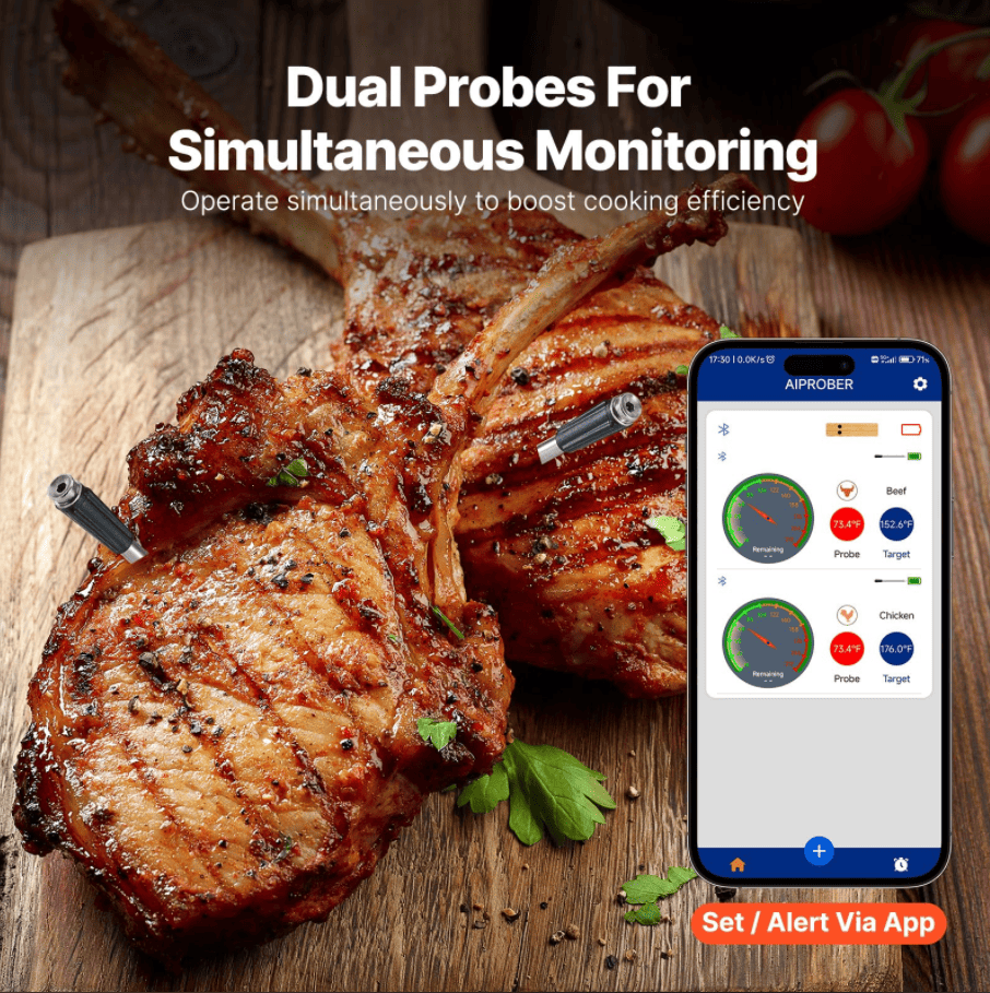 SKU: PSJX168A barbecue meat thermometer SUS304 food grade Bluetooth 5.2 transmission distance 700FT battery life 24h 1000mah response time 1 second probe temperature sound warning source factory quality assurance good quality and low price retro style